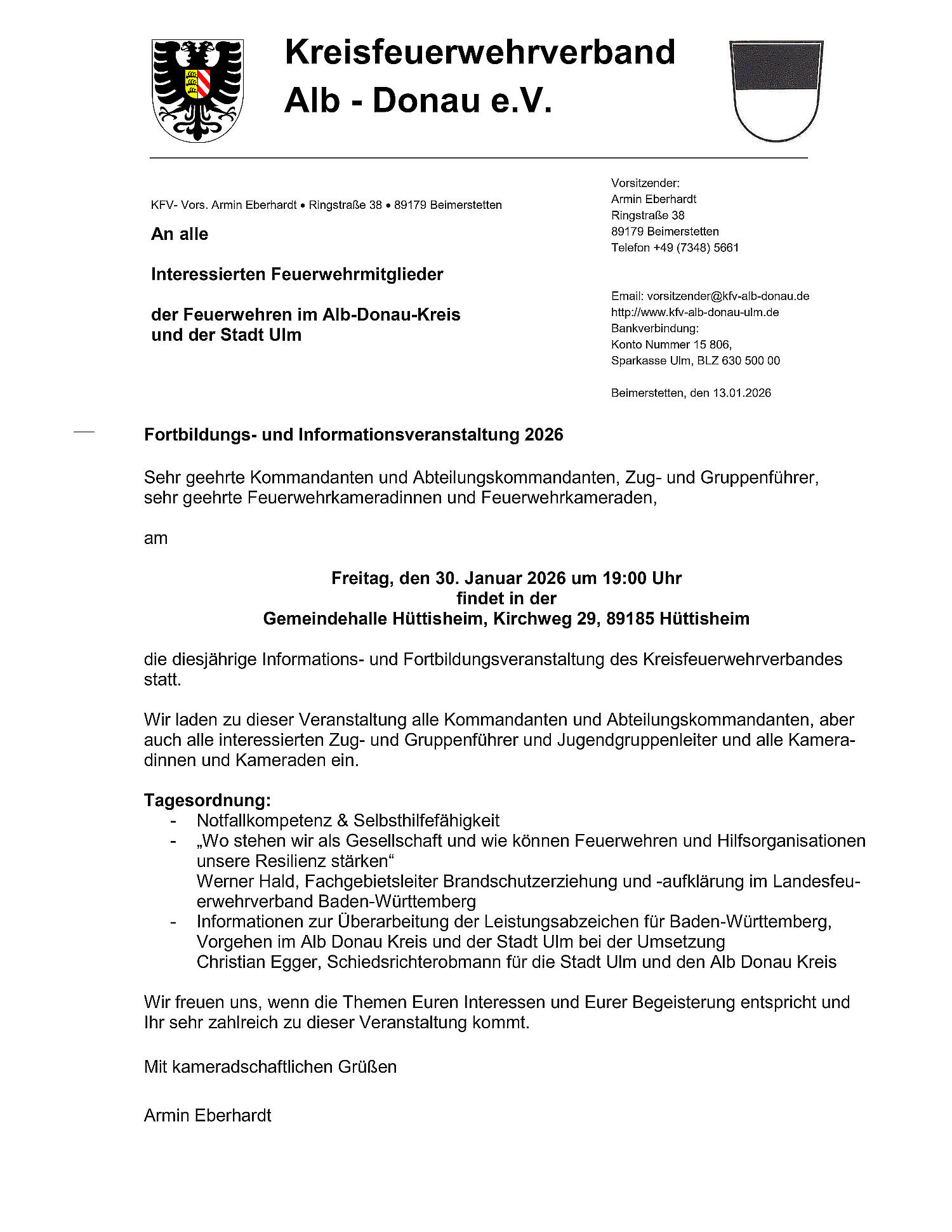 « Alle Veranstaltungen Diese Veranstaltung hat bereits stattgefunden. KFV – Fortbildung 2026 30. Januar 2026 um 19:00 « Fw Schnürpflingen Informationsveranstaltung Treffen der KFV – Altersmitglieder 2026 » Zum Kalender hinzufügen Google Kalender iCalendar Outlook 365 Outlook Live Details Datum: 30. Januar 2026 Zeit: 19:00 Veranstaltungskategorie: KFV Alb-Donau Veranstaltungsort Mehrzweckhalle Hüttisheim Kirchweg 29 89185 Hüttisheim, BW Germany Google Karte anzeigen Telefon 0730524527 Veranstalter KFV Alb-Donau Telefon 073485661 E-Mail *protected email* Veranstalter-Website anzeigen